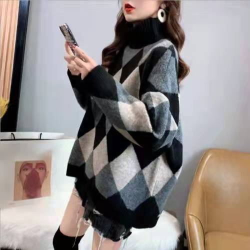 秋冬新款套头撞色菱格高领毛衣女